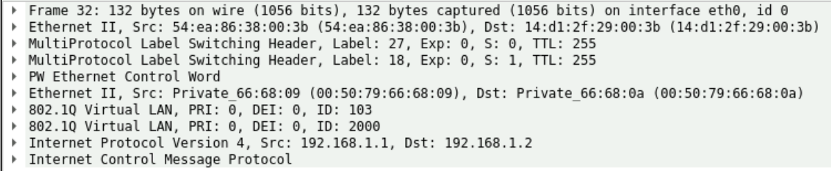 0x8100. At this point, there could be several tags now on the frame - When the frame reaches the AGG router, we use a combination of the outer and inner tag to demultiplex the traffic into the PW. The matching frames are then encapsulated with the service label. Recursive next hop resolution on the protocol next hop resolves in the inet.3 table to the LSP where the transport label is added to the frame. The frame is then sent to the egress interface towards the remote router.
