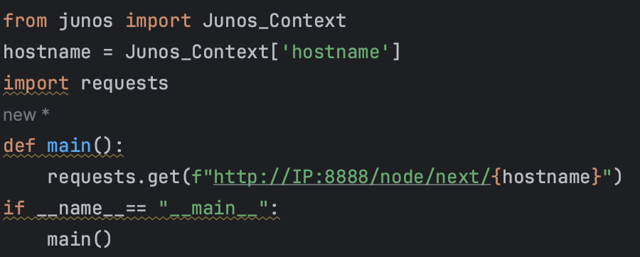 The script above gathers the local Juniper's hostname and uses it as the primary key in the Oxidized Rest API call. The 'requests' library is available to use with Juniper on-box scripts without any additional installations.
