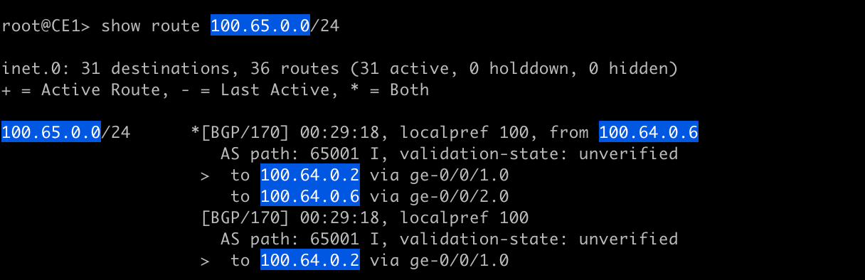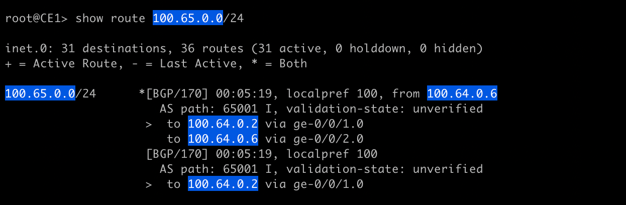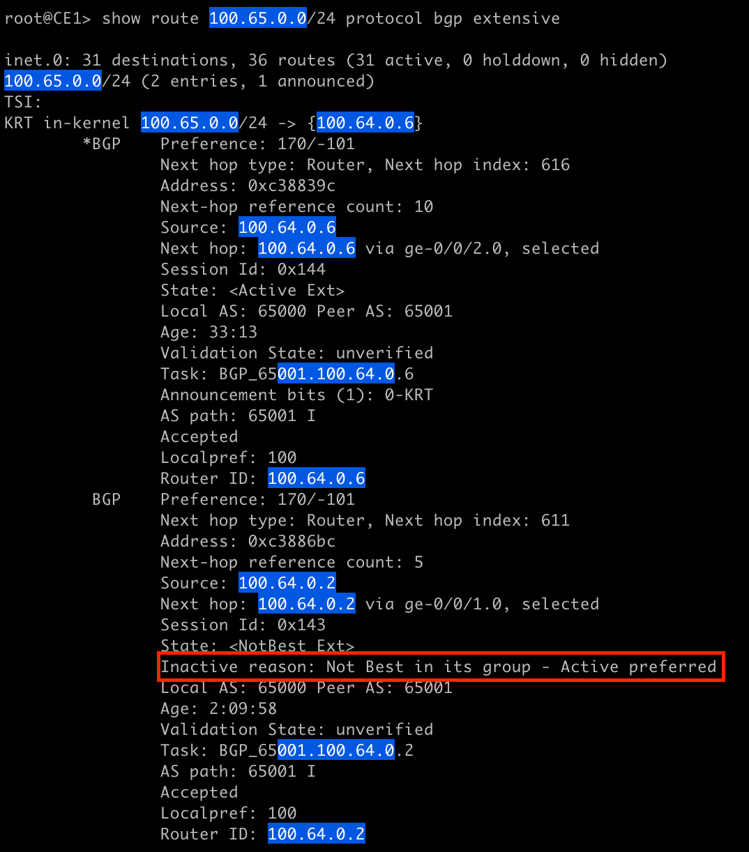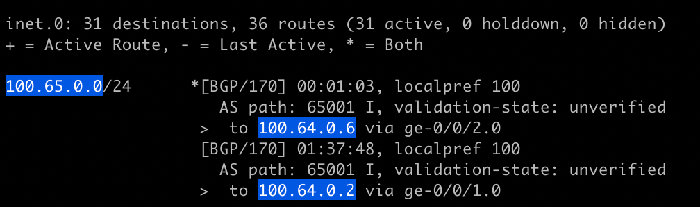 The output tells us we have learned the prefix 100.65.0.0/24 from two BGP neighbors in the same AS but the best path is through 100.64.0.6. In this case the best path is the one that was active first (rule 11).
