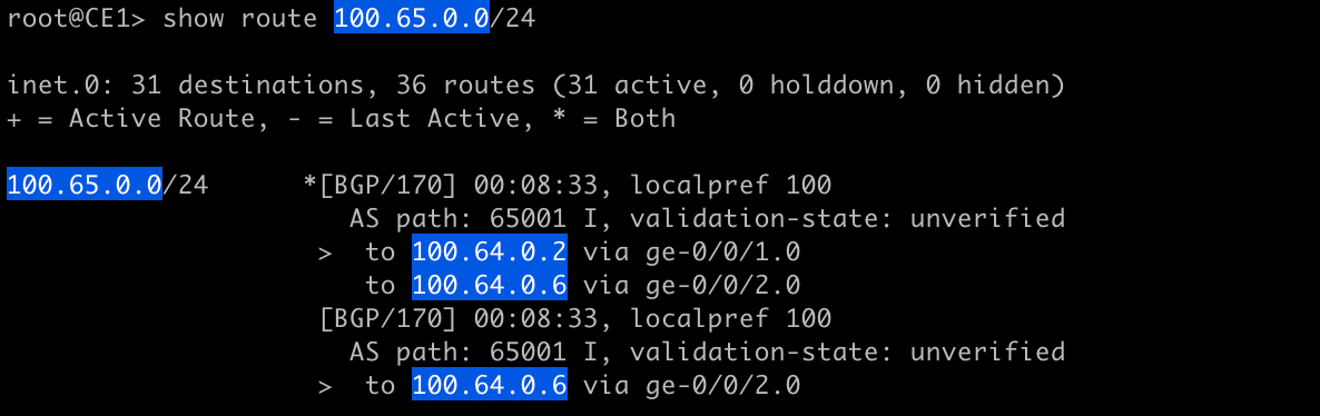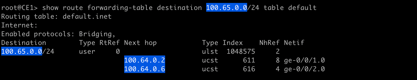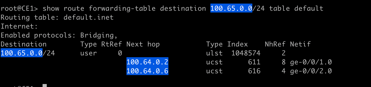 }If we run the same commands, we see the same routing table output because the changes we made changed the way the forwarding table gets programmed not the routing table. But if we take a look at the forwarding table, we will see there are multiple next hops listed for 100.65.0.0/24.