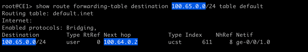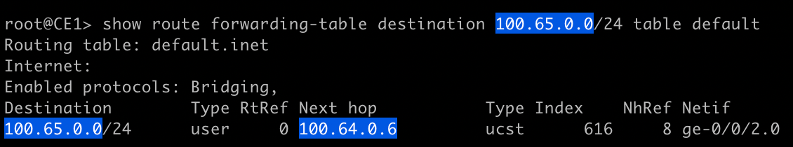 Notice that the other BGP route's next-hop has been copied to the active route's list of available next-hops and its been selected? This output is tricky because even though there are two next-hops listed for prefix 100.65.0.0/24, only one will be used. So other than copying the next-hop of other routes into the active route, what did multipath do? It enabled per-prefix load balancing. On a sufficiently large number of routes, the Juniper will hash the route and attempt to load balance traffic per-prefix. This means that even though 100.65.0.0/24 has two next-hops listed, only one will be used. We can prove this again by taking a look at the forwarding table.