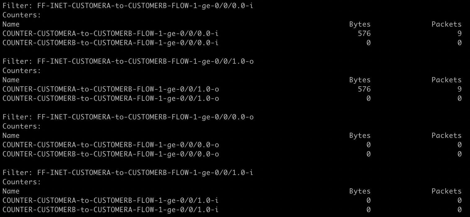 However, using firewall filters, we can take the expected traffic flow and match it bi-directionally on each end and confirm packets are being delivered as expected.