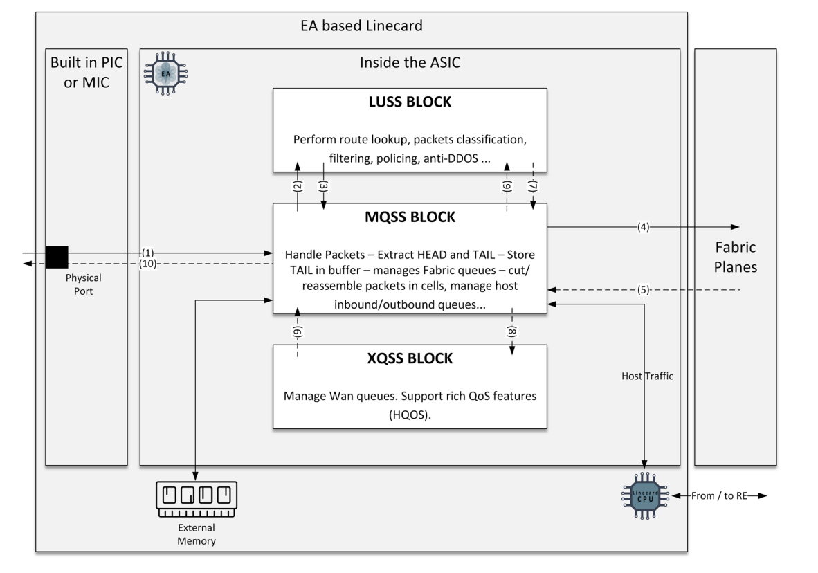 Below is the MX204 (EA TRIO) functional block diagram. As data arrives from the WAN interface (PIC/MIC) and traverses the MQSS and LUSS, there is an opportunity to dump that traffic into RAM and then retreive it if you know at least something about the data.
