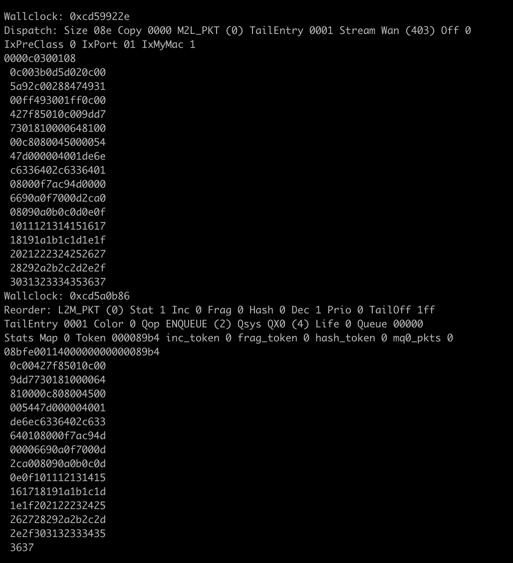 Below you'll see any packets that matched the filter you create above. You will see two entries for any given matched packet. One as the packet arrives at the MQSS block from the WAN interface (PIC/MIC), and another as the packet arrives at the MQSS block from the LUSS block.
