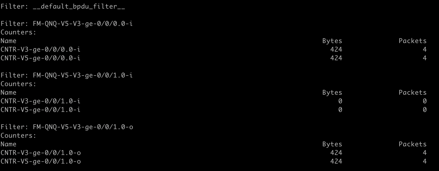 After talking with the customer, they are using outer-tag 5 and inner-tag 3. We can use this information to plug into our flexible firewall filter and count packets at each end of the circuit. The test here is to see if both customers are sending bi-directional traffic on the correct VLANs.